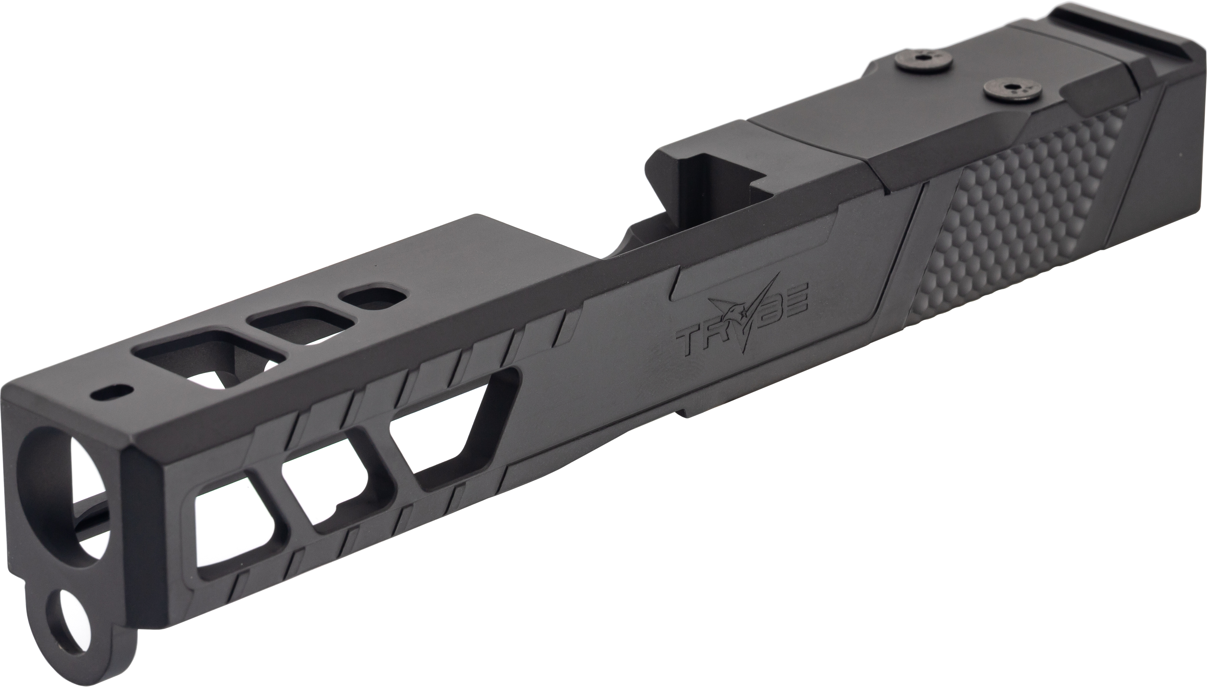 Upgrade your weapon with the TRYBE Defense Glock 19 Pistol Slide (V2) to improve your handgun’s performance and add compatibility with popular red dot sights. TRYBE Defense designed our Pistol Slides & Slide Parts with an aggressive texture that’s easy to grip, and multiple windows to show off your aftermarket barrel. Each TRYBE Defense Glock 19 Slide is constructed from 416 stainless steel billet, and heat treated and coated for enhanced durability and resistance to corrosion and wear. TRYBE Defense has your back with multiple options available that allow you to mount tactical optics onto your firearm, including the popular RMR cut. Grab a TRYBE Defense Glock 19 Pistol Slide to improve your weapon’s handling, compatibility, and aesthetics. Don’t just upgrade your Glock 19 with this killer slide. The innovators at TRYBE have all of the Pistol Parts you need to keep your side piece looking nasty and operating at a high level! TRYBE Defense Match-Grade Threaded and Non-Threaded Pistol Barrels provide unrivaled performance in several gorgeous finishes. And if you’re looking for something to finish off a threaded barrel, the TRYBE Defense Universal 9mm Compensator is there to significantly reduce muzzle rise and sensed recoil. Hate the feeling of sending your last round down range? We know the pain. Increase your carrying capacity and general happiness and add 4-5 extra rounds with the TRYBE Defense +4/5 Magazine Extension for Glock pistols. Have a slide but still need the tools to complete your build? The TRYBE Defense Glock Slide Parts Completion Kit can get the job done, and it’s available both with or without a guide rod. Something nice to replace your stock Glock trigger? TRYBE Defense has your back with our line of sleek polymer TRYBE Defense Glock Triggers, available in 4 color combinations. And you’re going to need something to carry all that swag. Finish it off with a TRYBE Tactical Pistol Case to wrap your firearm in soft, cushy protection. If you need room for more gear, the spacious TRYBE Tactical Range Bag has all the right pockets to keep you supplied and organized. For other quality gear to carry and protect everything you’d need for a day at the range, check out the premium field accessories that your loyal friends at TRYBE Tactical and TRYBE Optics have for you. Start customizing today and get ready to JOIN. THE. TRYBE. The below information shows the screw sizes, which vary by Optic Cut: Cover Plates: 6 x 32 x 1/4; RMR Cut: 6 x 32 x 7/16 (both sides); DeltaPoint Pro Cut: #6-32 x 3/4″ Flat Head (left) / #6-32 x 5/8″ Flat Head (right); Viper Cut: #6-32 x 7/16″ Flat Head (left) / #6-32 x 3/8″ Flat Head (right); Venom Cut: #6-32 x 7/16″ Flat Head (left) / #6-32 x 3/8″ Flat Head (right); Other design options available here. Specifications for TRYBE Defense Glock 19 Pistol Slide Version 2: Manufacturer: TRYBE Defense Gun Make: Glock Gun Model: Glock 19 Cartridge: 9mm Luger Finish: Cerakote Fabric/Material: 416 Stainless Steel Billet Features of TRYBE Defense Glock 19 Pistol Slide Version 2 Plate Cover Hex Tool: 2mm Slide Cover Screw Type: #6-32 x 1/4″ Flat Head RMR Optic Screw Type: #6-32 x 7/16″ Flat Head (both sides) Package Contents: TRYBE Defense Glock 19 Pistol Slide Version 2 Similar Products to TRYBE Defense Glock 19 Pistol Slide Version 2 TRYBE Defense Pistol Parts TRYBE Defense Match-Grade Threaded and Non-Threaded Pistol Barrels TRYBE Defense Universal 9mm Compensator TRYBE Defense +4/5 Magazine Extension for Glock TRYBE Defense Glock Slide Parts Completion Kit TRYBE Defense Glock Triggers TRYBE Tactical Pistol Case TRYBE Tactical Range Bag TRYBE Warranty TRYBE™ products are made for performance and durability and are covered by a comprehensive warranty depending on the type of product. See full warranty information here